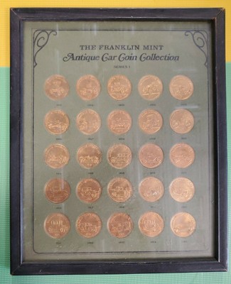 1 - Antique Car Coin Collection - Series 2 - 1969 This solid bronze coin set consists of 25 coins measuring 1 diameter displaying cars from the 1901 Phelps Tractor to the 1925 Chrysler Six. FRANKLIN MINT ANTIQUE car Coin Collection Series 1 and 2 - 2000. 1 - Antique Car Coin Collection - Series 2 - 1969 This solid bronze coin set consists of 25 coins measuring 1 diameter displaying cars from the 1901 Phelps Tractor to the 1925 Chrysler Six.